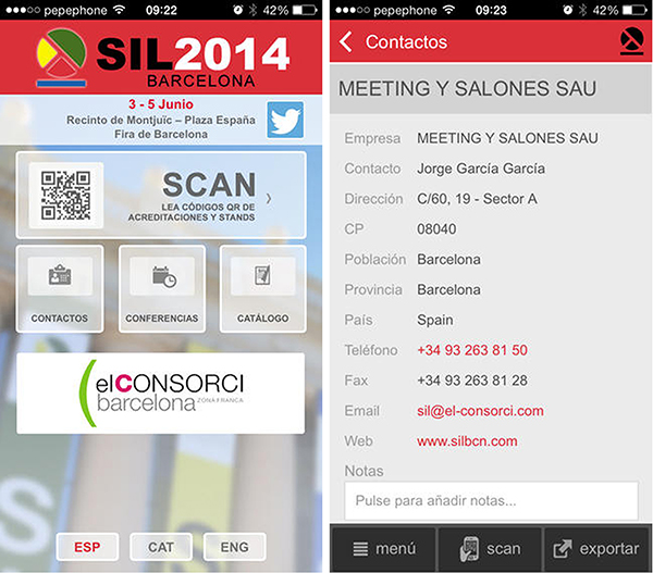 Esta nueva App permitirá a todos sus usuarios capturar todos los datos de los contactos realizados en el SIL 2014 sin necesidad de tener que intercambiar y acumular tarjetas de visitas. Esta App permite enviar todos los datos de los contactos al correo electrónico que se desee, donde recibirá un documento en formato Excel con todos los datos capturados. Al mismo tiempo, también permite realizar anotaciones personales asociadas a un contacto en concreto. Con un manejo muy intuitivo, su funcionamiento es muy sencillo. Esta App incorpora un lector de códigos Qr que permitirá capturar toda la información que contenga el código Qr de cada acreditación profesional realizada en el SIL 2014.