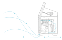 El sistema de flujo de aire inteligente de la impresora 1860 dirige aire limpio y frío a los componentes fundamentales, a fin de ampliar el intervalo de temperaturas de funcionamiento estable de 0 a 50 C, incluso en los entornos más difíciles.