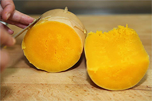 El consumidor final tiene una calabaza cortada que, que mantiene todas sus propiedades organolépticas (y que no ha perdido sus vitaminas ni su jugo al haberse cocido al vapor).